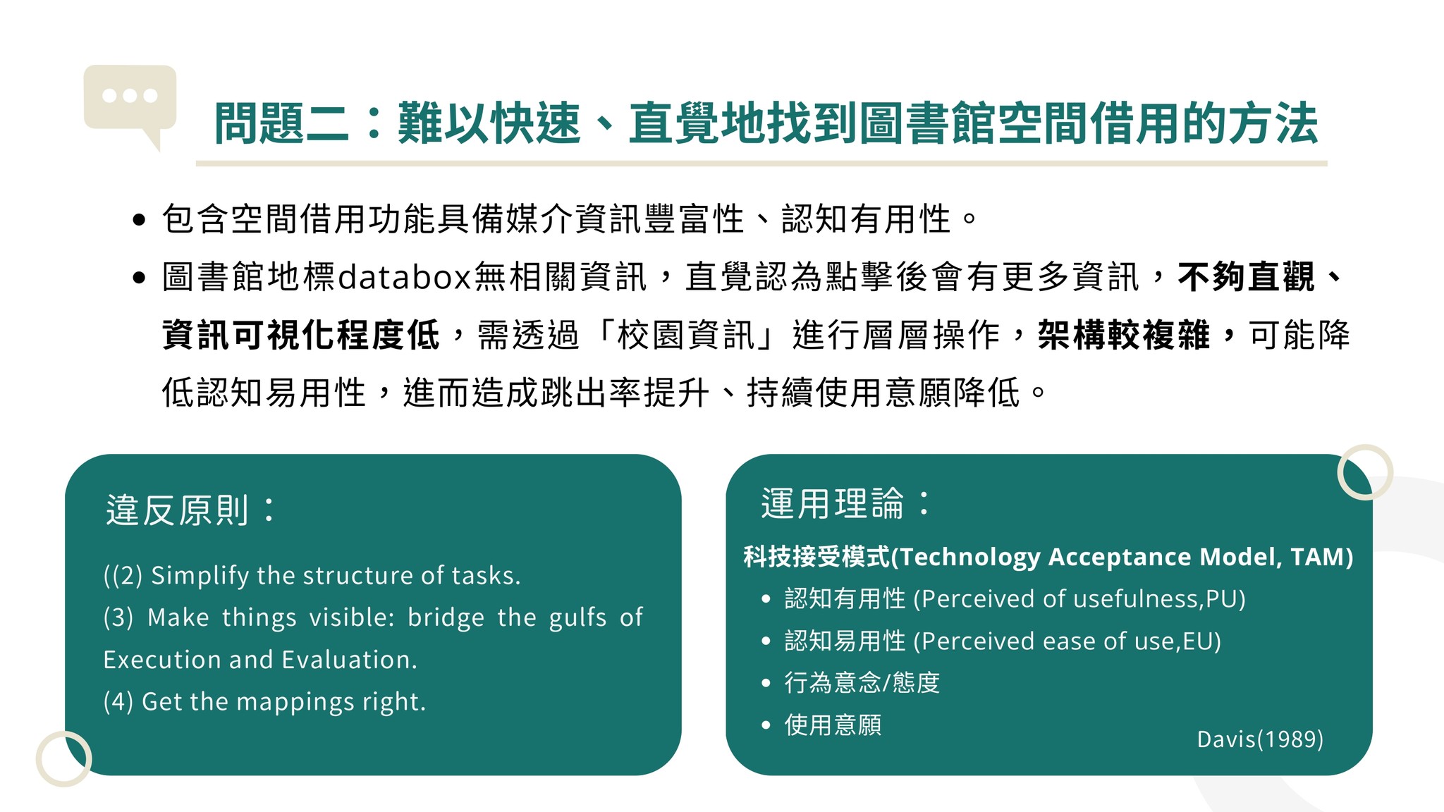 使用者難以透過導航介面快速找到圖書館,需多次滑動與點擊。空間借用操作隱晦: