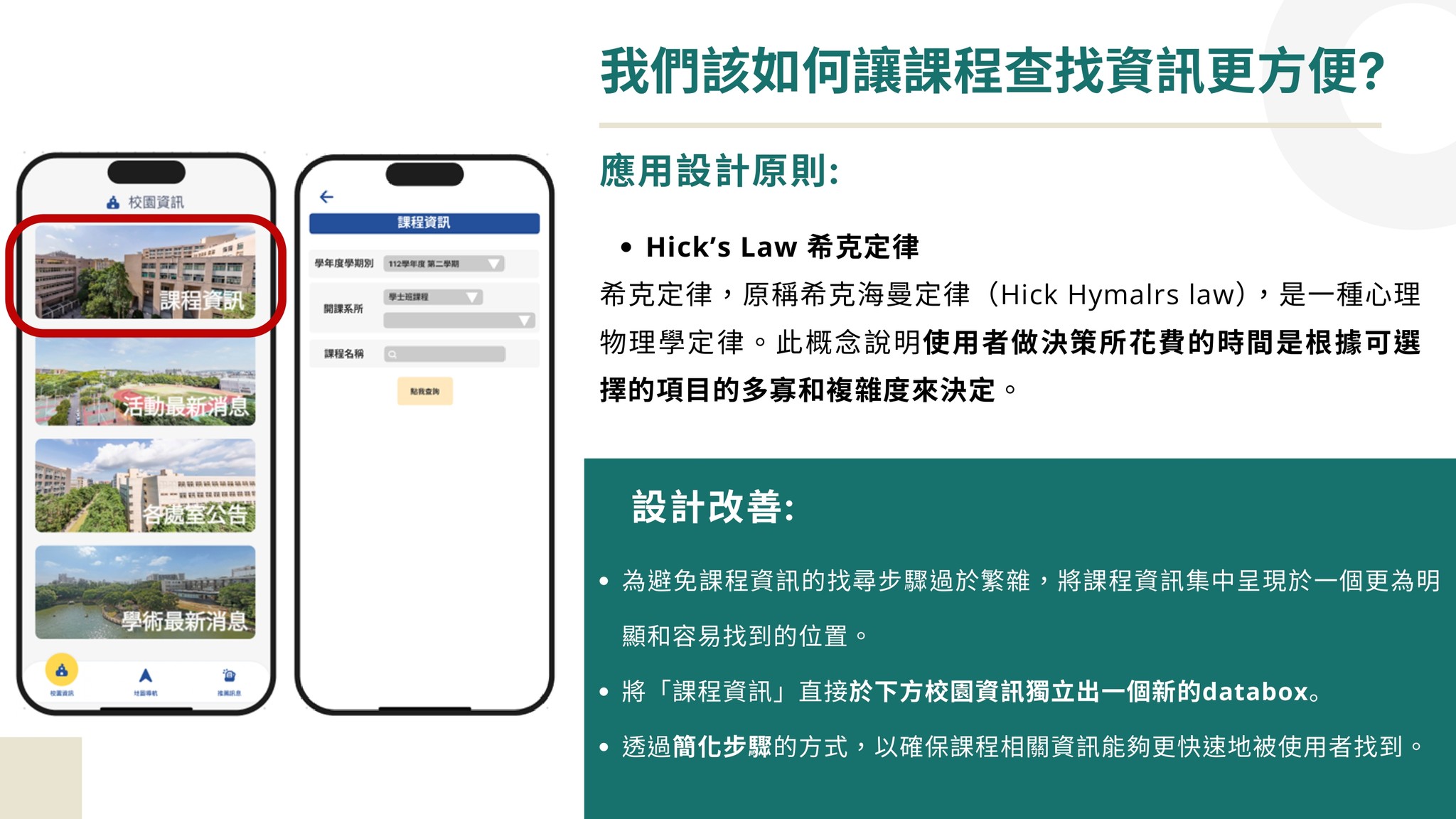 將「課程資訊」於首頁「校園資訊」獨立成 databox,提升易見性與可操作性。(應用 Hick’s Law)圖書館資訊整合: