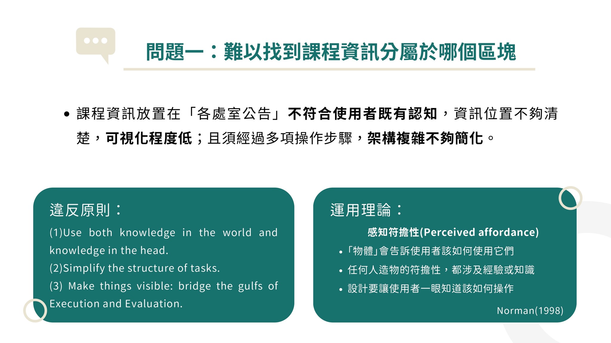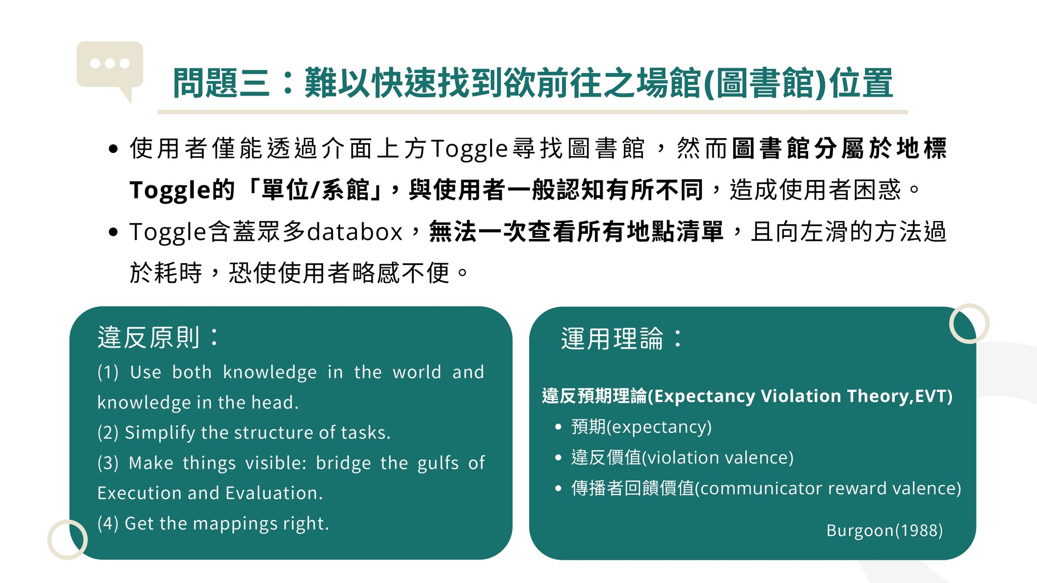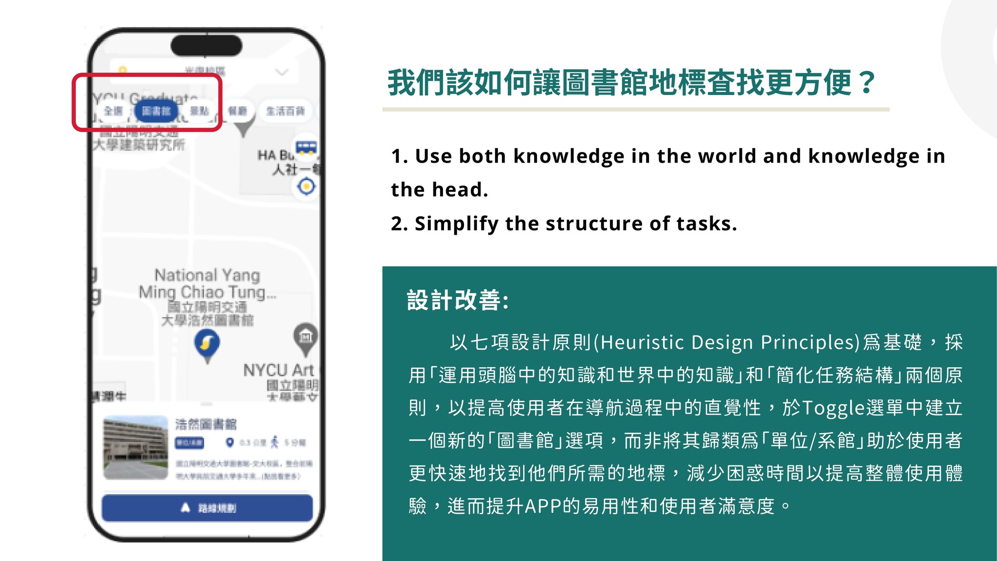 依據七項 Heuristic Design Principles 進行問題診斷,針對課程資訊查找、場館導航、空間借用等任務進行評估。
