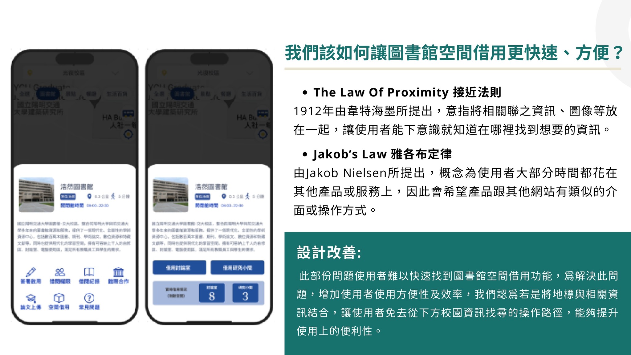 將「圖書館」獨立於 toggle 分類,並於 databox 結合空間借用、開放時間、導航等功能。(應用 Jakob’s Law、接近法則)